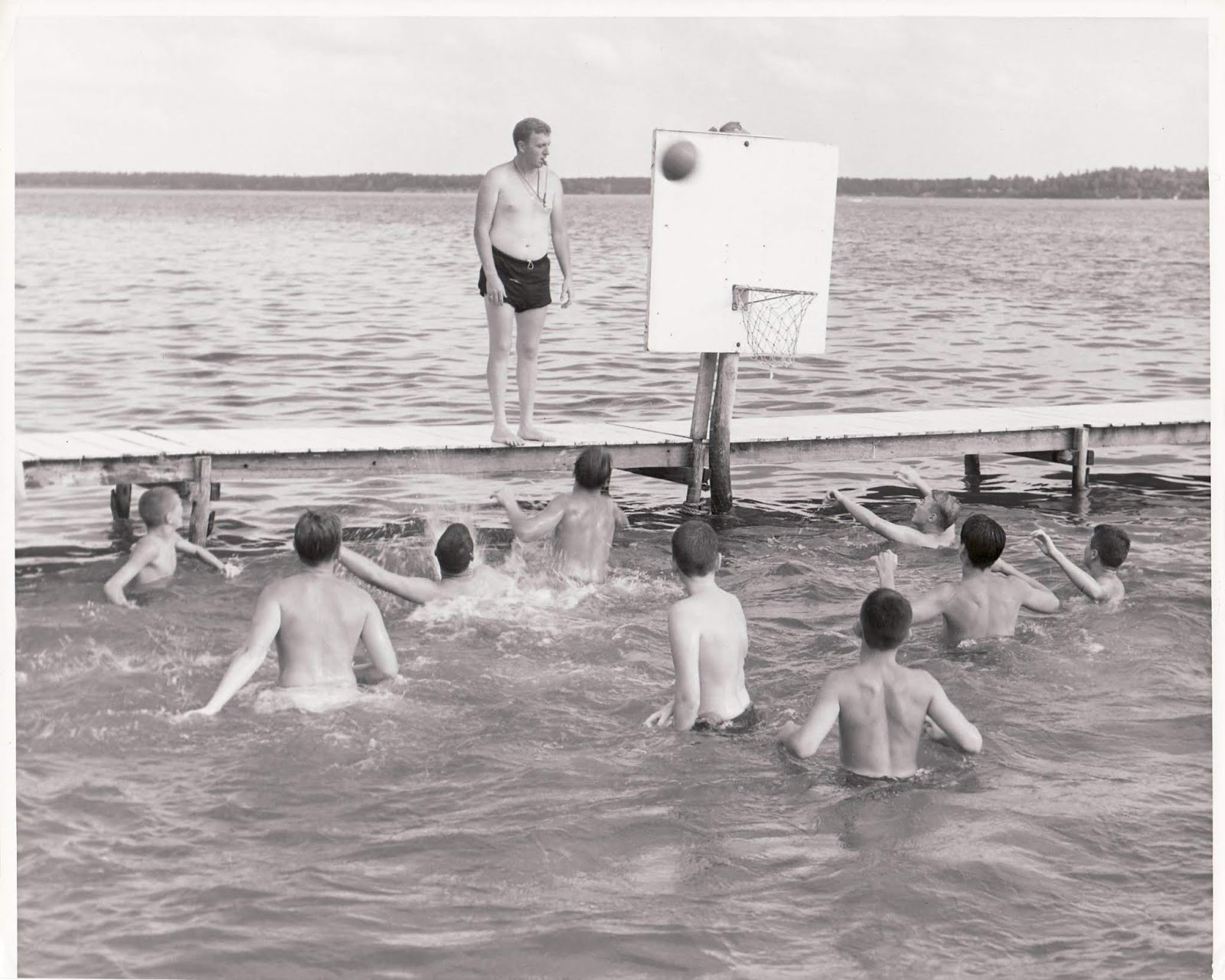 With the 50s come big changes to Camp! Bob and Vi Schmid take over Camp Foley from Father Foley. This is the time where we see the first mention of the “checkboard” and buddy system. There is also the start of an “Alert Squad of Lifeguards” that are stationed down at the swim dock. We also get our first shots of the kids playing water basketball, which is still a popular activity today! On the left, you can see the boys standing on the old version of the diving tower, and doing some diving that would not fly at a diving class today haha! In 1951, swim classes became optional for campers who had passed their swim check.