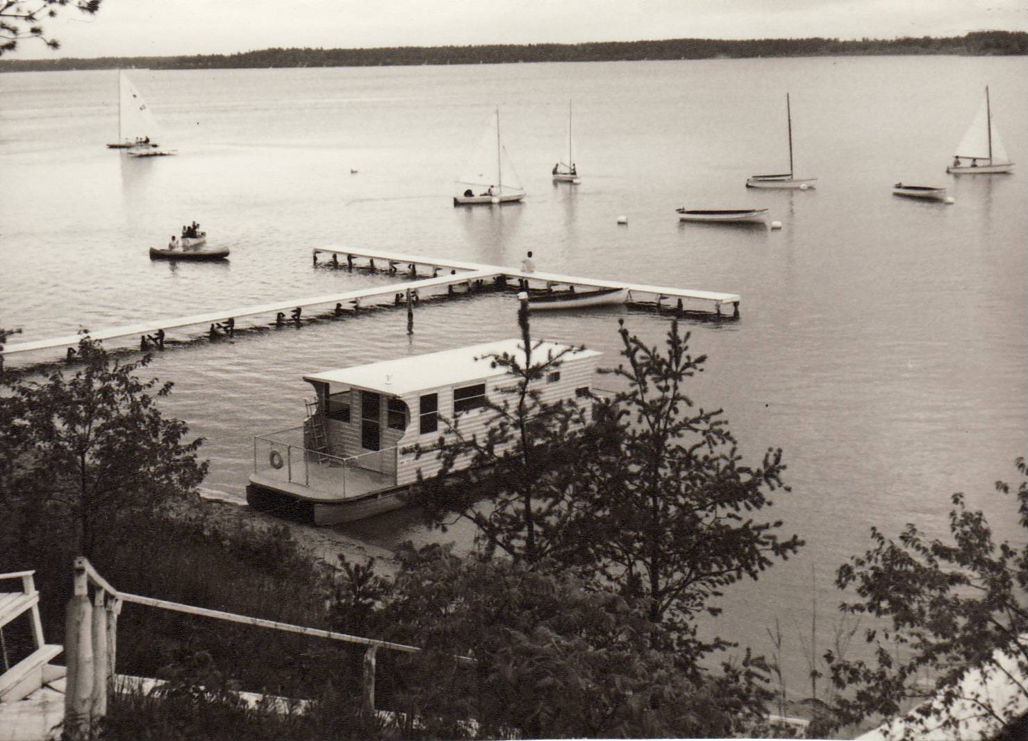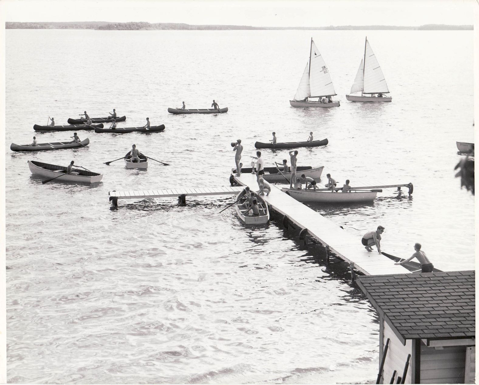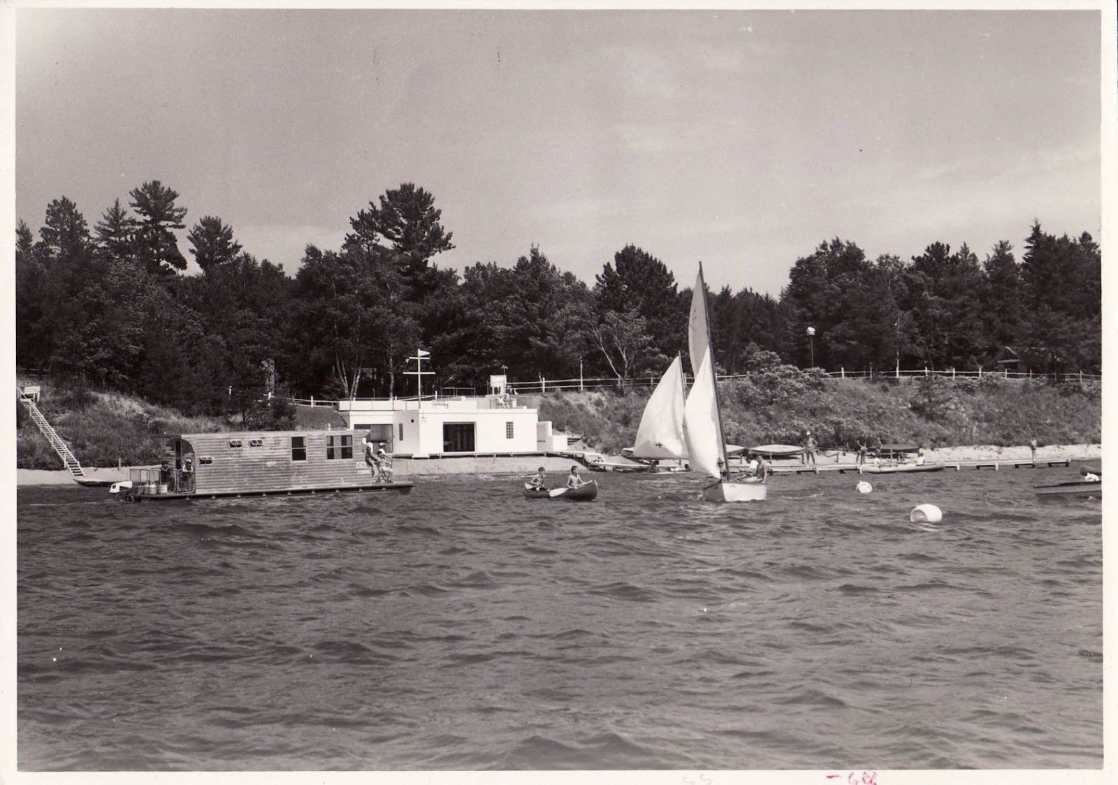 Starting out with the first available photos we have in our archives in the 30s! Some of the boats seen at camp will be familiar, but many will notice that many others are missing. At Camp St. Thomas (the original name for Camp Foley) when Father Foley was running it, the boy campers had access to canoes made of wood! They sailed these canoes on windy days with special sails. One of the only boats with a motor seen around camp was the Mail Boat! This boat brought mail to the campers every week from the closest post office that was across the lake.